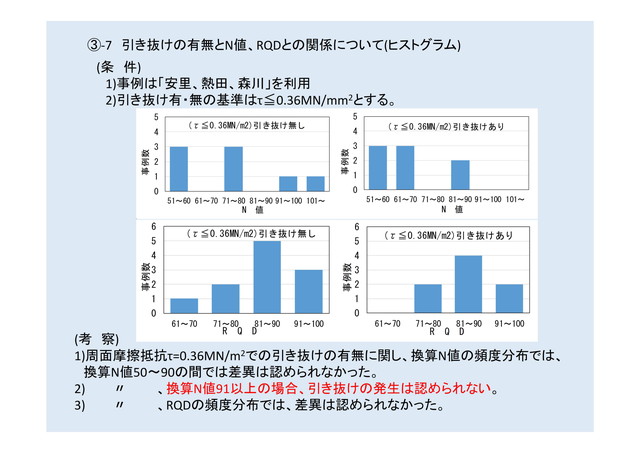 N値、RQD値と基本試験時引抜けの有無との関係性の研究、換算N値91以上の地盤ではτ≧0.36N/mm2でも引き抜けない。