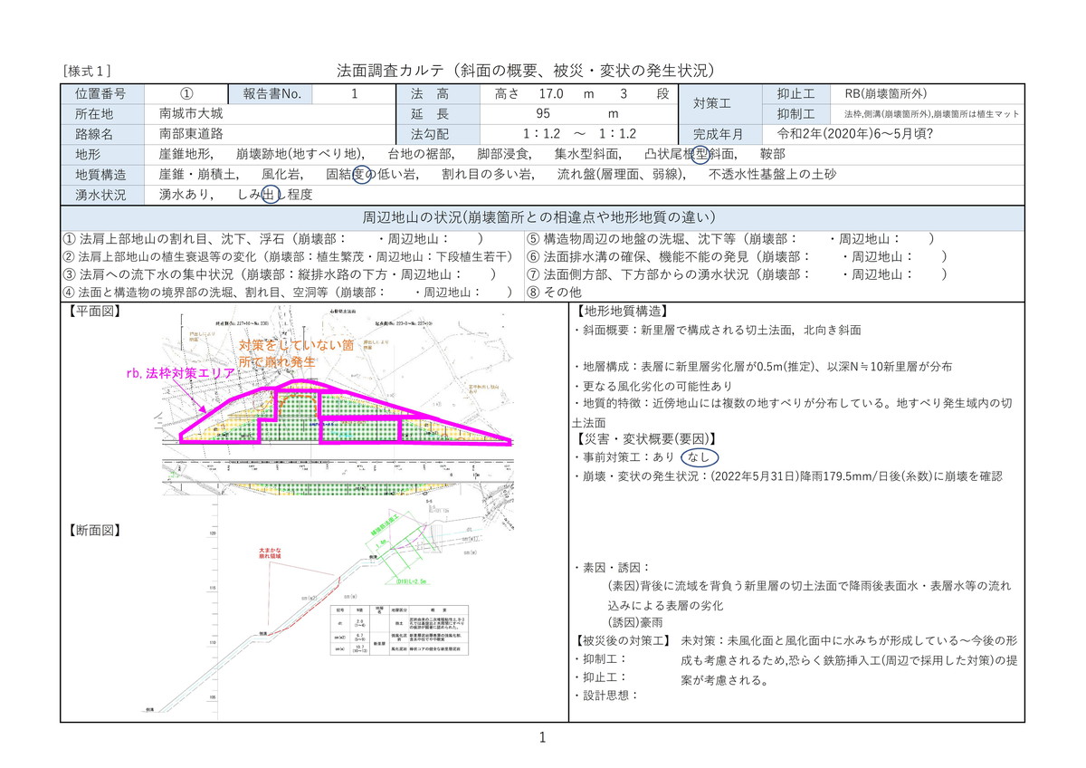 主な活動:法面調査カルテ(記入シート)の作成、切土法面の発災事例の収集・整理